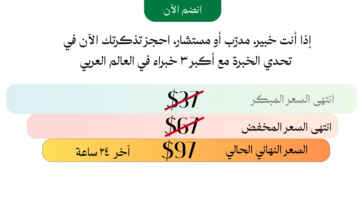في تحدّي الخبرة، سأعطيك الإطار التسويقي العملي الذي سيجعلك تخرج بمنتج تدريبي جاهز، وخطة تسويق واضحة لإطلاق مشروعك التدريبي بثقة، وبدون تخمين أو إضاعة وقت ومال